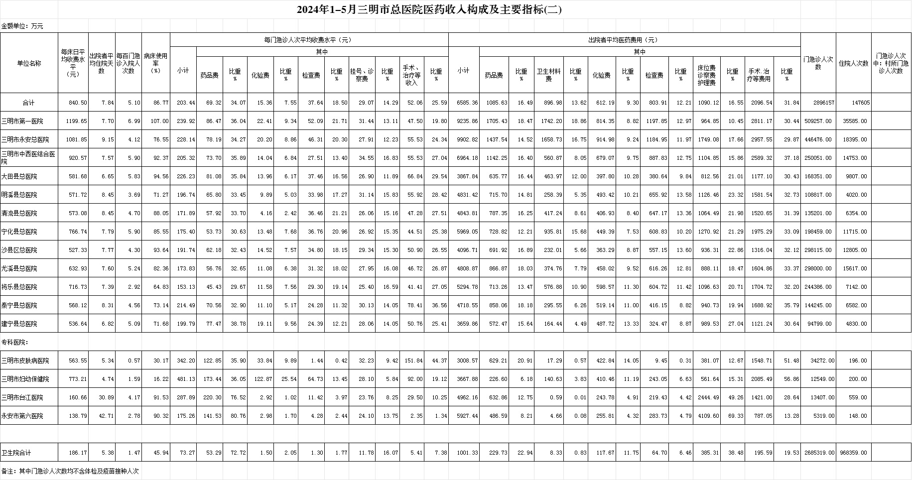 (一)1-5月份12家总医院运行情况:医药总收入164968.87万元,比去年同期167006.10万元减少2037.23万元,下降1.22%(不含体检、疫苗接种和结算差额等收入的医药收入为164968.87万元,比去年同期138498.16万元,增加8604.3万元,增长6.21%)。其中:医疗服务性收入76280.92万元,占医药收入46.24%(床位收入4814.84万元、手术治疗护理等服务收入67006.24万元,结算差额4459.83万元),比去年同期77663.37万元,医疗服务性收入减少1382.45万元,下降1.78%;检查化验收入37193.82万元,占医药收入22.55%,同比下降6.51%;药品收入36823.11万元,药占比22.32%,分别比去年同期增长0.91%、增长0.47个百分点;卫生材料收入14671.02万元(其中高值耗材收入8302.28万元),占医药总收入8.89%,比去年同期7.83%,增长1.07个百分点。入院人次147605人次,比去年同期128908人次,增加18697人次,增长14.50%;门急诊人次2896157人次,比去年同期2636814人次,增加259343人次,增长9.84%;每门诊次均费用203.44元,比去年同期214.73元,减少11.30元,下降5.26%;出院者平均费用6585.36元,比去年同期6788.95元,减少203.59元,下降3.00%。