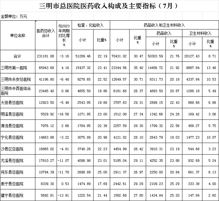 永安总医院46.77%、市中西医结合医院53.78%、大田县总医院51.01%、明溪县总医院49.66%、清流县总医院49.32%、宁化县总医院50.92%、沙县总医院51.36%、尤溪县总医院47.87%、将乐县总医院48.03%、泰宁县总医院53.02%、建宁县总医院50.76%,仅市第一医院、尤溪县总医院未完成考核指标。