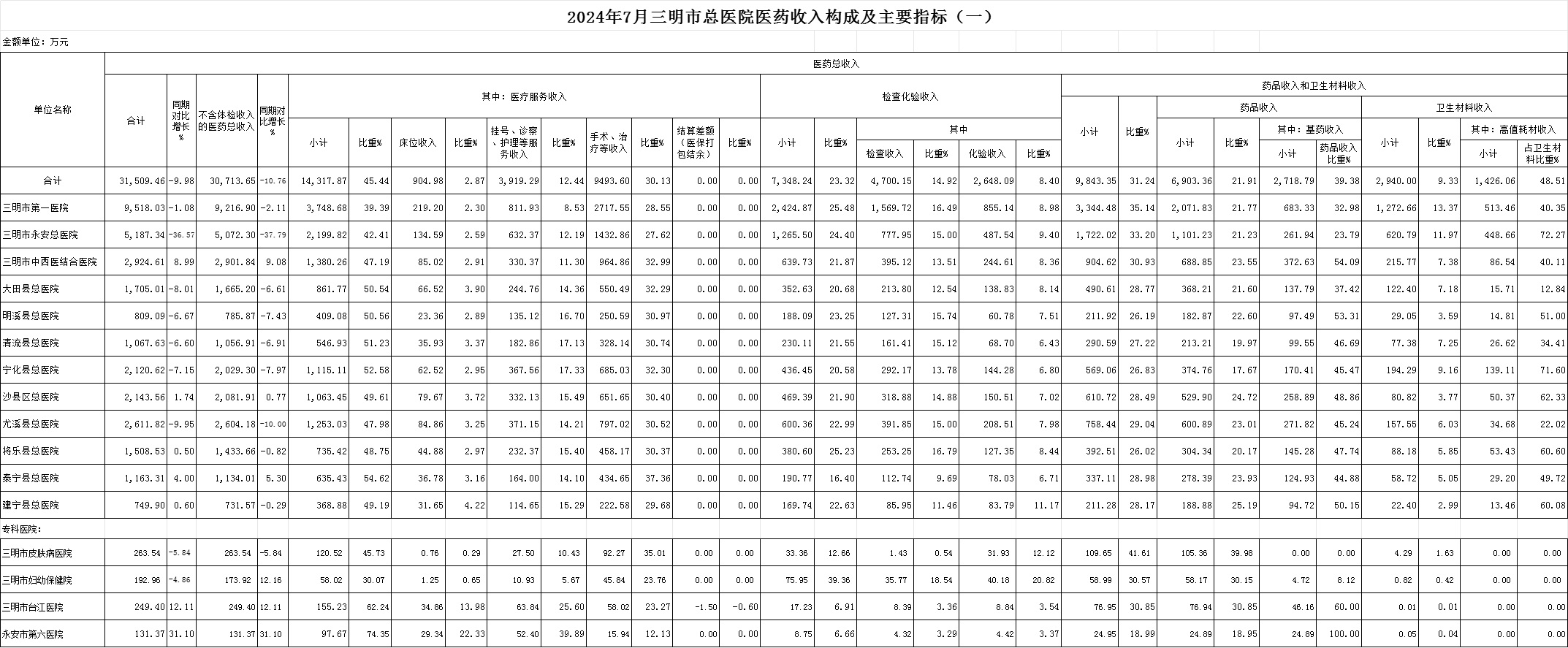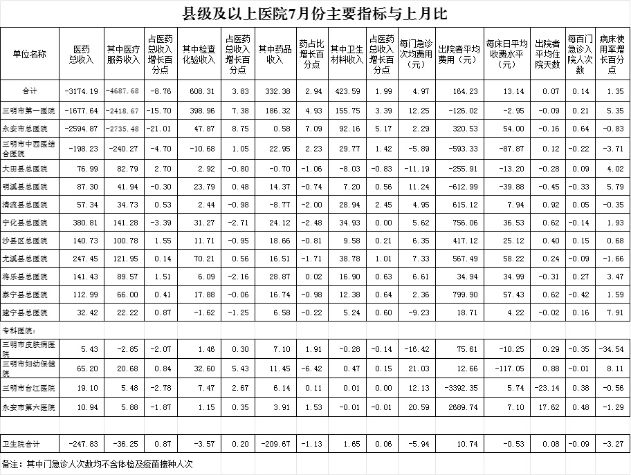 1.医药收入:7月份12家总医院医药总收入31509.46万元,比去年同期35002.27万元,减少3492.81万元,下降9.98%。其中:医疗服务性收入14317.87万元,占医药收入45.44%(床位收入904.98万元、手术治疗护理等服务收入13412.88万元),比去年同期15819.54万元, 医疗服务性收入减少1501.67万元,下降9.49%;药品收入6903.36万元,比去年同期7082.96万元,减少179.60万元,下降2.54%。