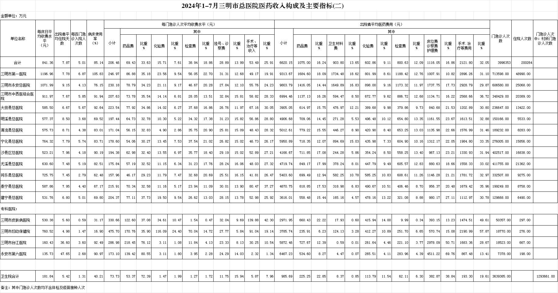 (一)1-7月份12家总医院运行情况:医药总收入231181.08万元,比去年同期238713.71万元减少7532.62万元,下降3.16%(不含体检、疫苗接种和结算差额等收入的医药收入为201795.28万元,比去年同期194858.28万元,增加6937万元,增长3.56%)。其中:医疗服务性收入109460.61万元,占医药收入47.35%(床位收入6586.09万元、手术治疗护理等服务收入93117.85万元、结算差额9756.67万元),比去年同期112520.46万元,医疗服务性收入减少3059.86万元,下降2.72%;检查化验收入51289.46万元,占医药收入22.19%,同比下降9.68%;药品收入50303.59万元,药占比21.76%,分别比去年同期下降0.93%、增长0.49个百分点;卫生材料收入20127.43万元(其中高值耗材收入11051.58万元),占医药总收入8.71%,比去年同期7.80%,增长0.90个百分点。入院人次200264人次,比去年同期186660人次,增加13604人次,增长7.29%;门急诊人次3996353人次,比去年同期3732689人次,增加263664人次,增长7.06%;每门诊次均费用206.46元,比去年同期215.70元,减少9.24元,下降4.28%;出院者平均费用6620.15元,比去年同期6610.88元,增加9.27元,增长0.14%。