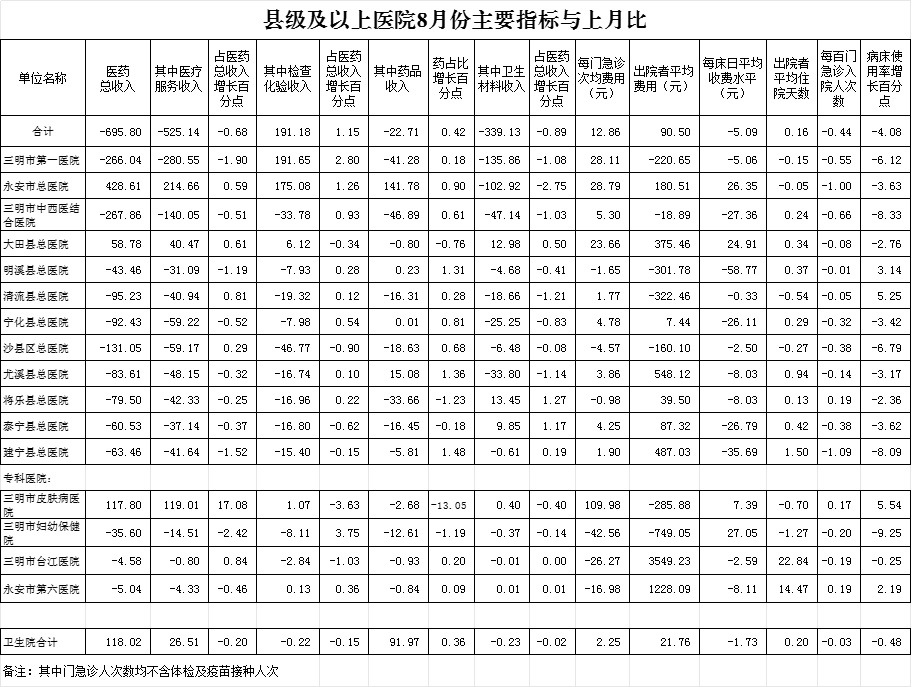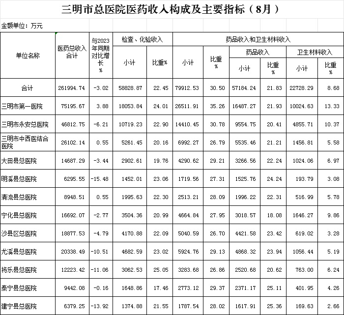 (一)1-8月份12家总医院运行情况:医药总收入261994.74万元,比去年同期270154.53万元减少8159.78万元,下降3.02%(不含体检、疫苗接种和结算差额等收入的医药收入为229226.48万元,比去年同期223111.76万元,增加6114.72万元,增长2.74%)。其中:医疗服务性收入123253.34万元,占医药收入47.04%(床位收入7439.68万元、手术治疗护理等服务收入106106.17万元、结算差额9707.49万元),比去年同期125761.67万元,医疗服务性收入减少2508.33万元,下降1.99%;检查化验收入58828.87万元,占医药收入22.45%,同比下降9.78%;药品收入57184.24万元,药占比21.83%,分别比去年同期下降1.13%、增长0.42个百分点;卫生材料收入22728.29万元(其中高值耗材收入12267.05万元),占医药总收入8.68%,比去年同期7.90%,增长0.77个百分点。入院人次224923人次,比去年同期214648人次,增加10275人次,增长4.79%;门急诊人次4554744人次,比去年同期4304237人次,增加250507人次,增长5.82%;每门诊次均费用209.29元,比去年同期215.79元,减少6.50元,下降3.01%;出院者平均费用6651.68元,比去年同期6594.51元,增加57.17元,增长0.87%。