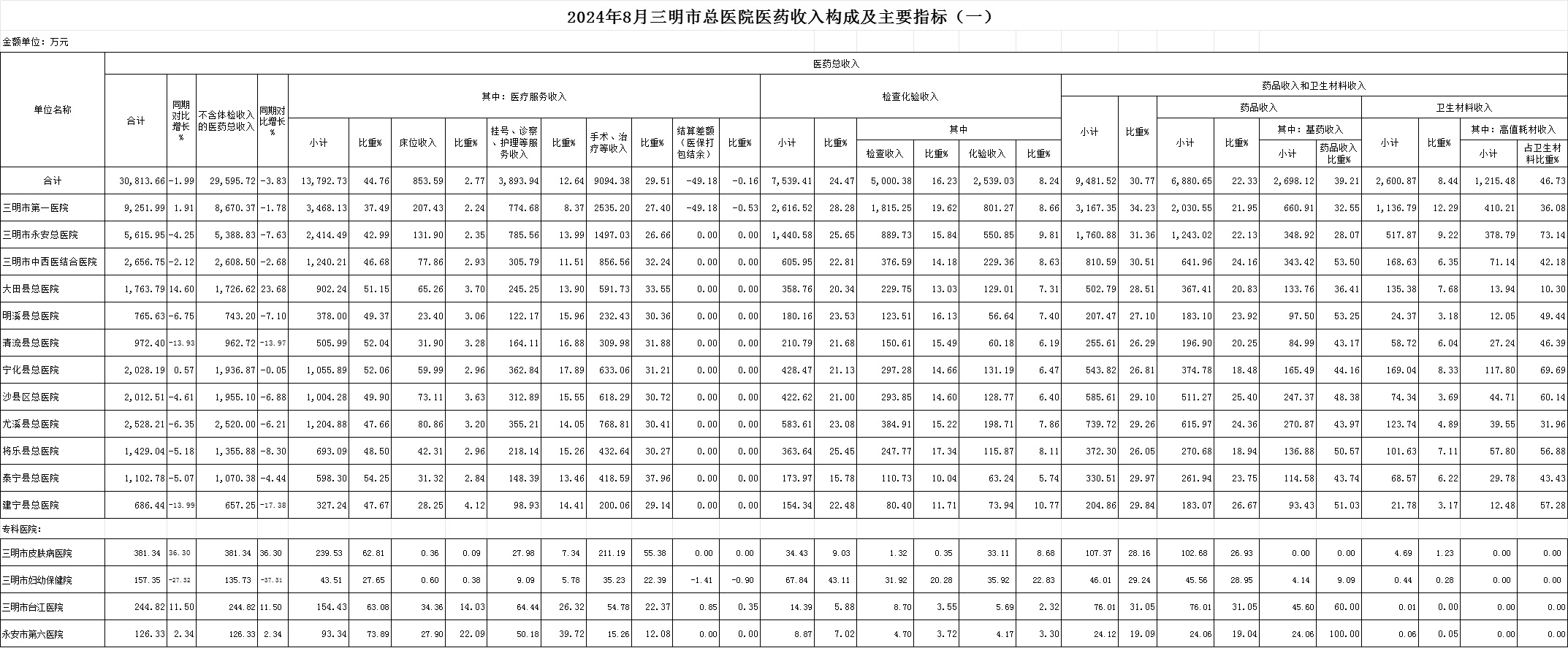 1.医药收入:8月份12家总医院医药总收入30813.66万元,比去年同期31440.82万元,减少627.16万元,下降1.99%。其中:医疗服务性收入13792.73万元,占医药收入44.76%(床位收入853.59万元、手术治疗护理等服务收入12988.32万元,结算差额-49.18万元),比去年同期13241.21万元, 医疗服务性收入增加551.52万元,增长4.17%;药品收入6880.65万元,比去年同期7061.83万元,减少181.18万元,下降2.57%。