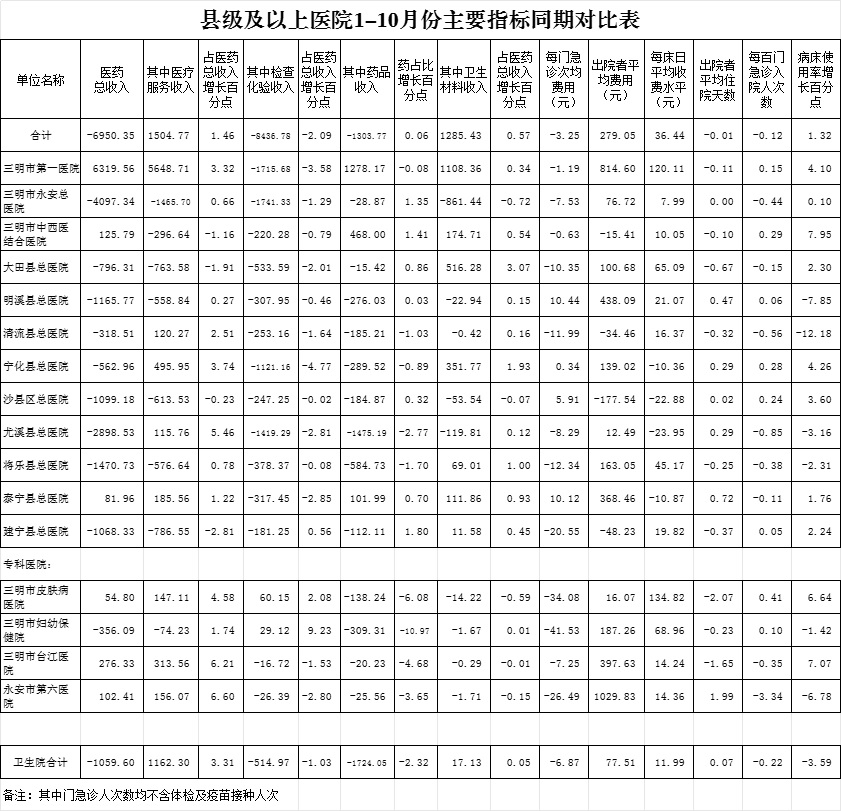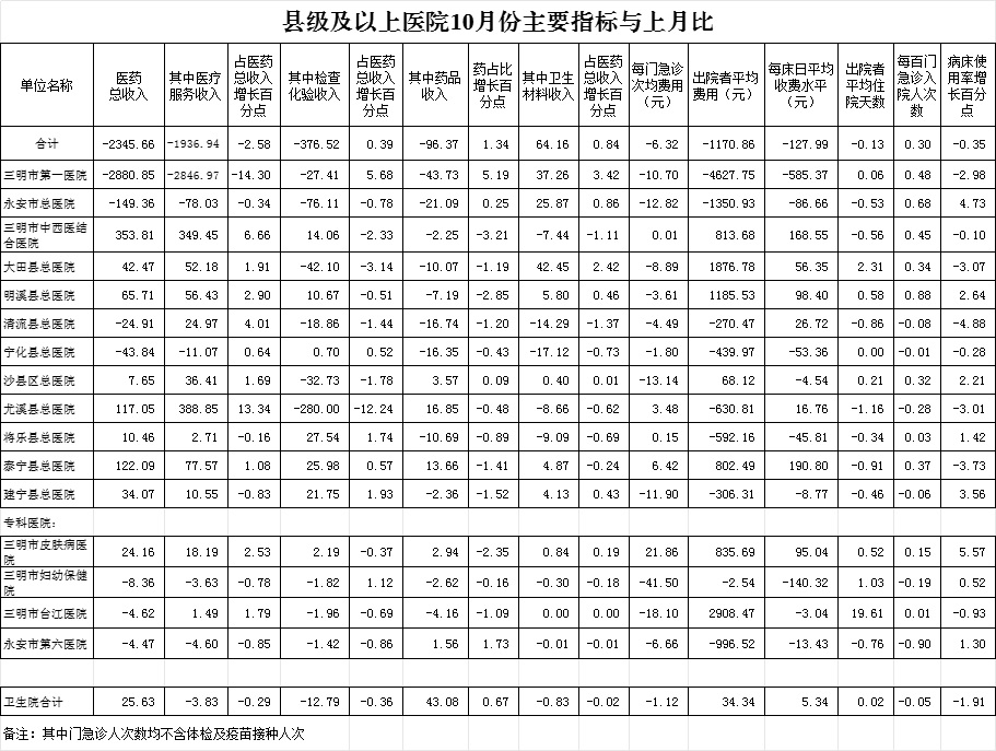 (一)1-10月份12家总医院运行情况:医药总收入322728.16万元,比去年同期329678.51万元减少6950.35万元,下降2.11%(不含体检、疫苗接种和结算差额等收入的医药收入为278338.5万元,比去年同期277409.58万元,增加978.92万元,增长0.35%)。其中:医疗服务性收入153153.64万元,占医药收入47.46%(床位收入9047.82万元、手术治疗护理等服务收入134398.32万元、结算差额9707.49万元),比去年同期151648.86万元,医疗服务性收入增加1504.77万元,增长0.99%;检查化验收入71666.78万元,占医药收入22.21%,同比下降10.53%;药品收入70215.11万元,药占比21.76%,分别比去年同期下降1.82%、增长0.06个百分点;卫生材料收入27692.63万元(其中高值耗材收入14155.18万元),占医药总收入8.58%,比去年同期8.01%,增长0.57个百分点。入院人次272444人次,比去年同期269005人次,增加3439人次,增长1.28%;门急诊人次5650918人次,比去年同期5439845人次,增加211073人次,增长3.88%;每门诊次均费用209.66元,比去年同期212.91元,减少3.25元,下降1.53%;出院者平均费用6825.24元,比去年同期6546.19元,增加279.05元,增长4.26%。