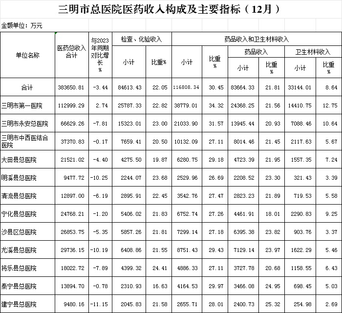 永安总医院45.43%、市中西医结合医院52.39%、大田县总医院50.95%、明溪县总医院49.63%、清流县总医院50.08%、宁化县总医院50.91%、沙县总医院51.01%、尤溪县总医院49.02%、将乐县总医院48.48%、泰宁县总医院53.4%、建宁县总医院50.41%,所有医院均完成了考核指标。
