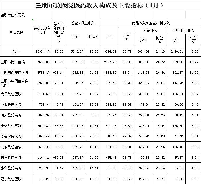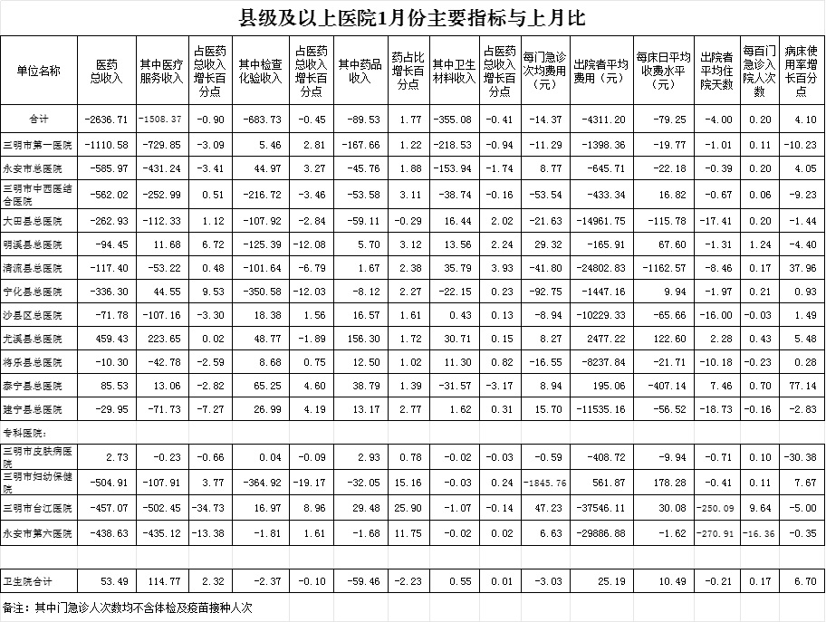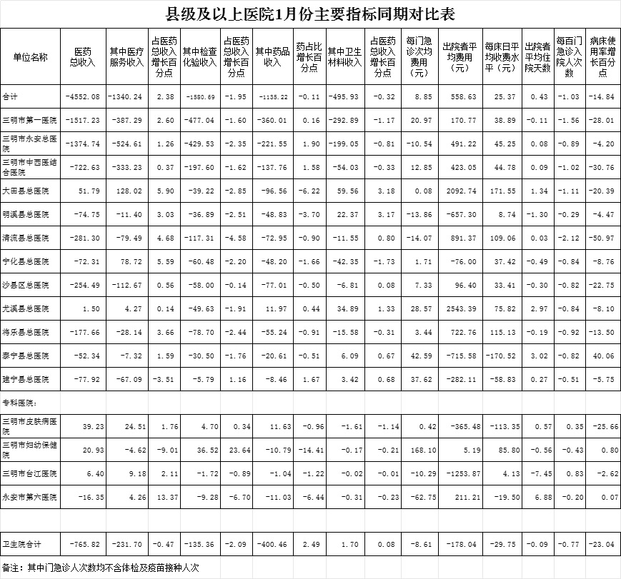 1-1月份基层医疗机构医药总收入4375.68万元(其中村所收入573.87万元),去年同期5141.51万元,同比减少765.82万元,下降14.89%,其中:医疗服务性收入1185.19万元,占医药收入27.09%(床位收入58.26万元、手术治疗护理等服务收入1126.94万元),去年同期1416.89万元, 医疗服务性收入同比减少231.70万元,下降16.35%;检查化验收入158.11万元,同比下降46.12%;药品收入3018.24万元,去年同期3418.70万元,同比减少400.46万元,下降11.71%,药占比68.98%,去年同期66.49%,同比增长2.49个百分点;卫生材料收入14.14万元,较去年同期12.44万元,同比增加1.70万元,占医药收入0.32%,较去年同期0.24%,同比增长0.08个百分点。入院人次3479人次,去年同期7646人次,同比减少4167人次,下降54.50%,其中明溪县、将乐县、尤溪县分别下降90%、71.43%、64.03%;门急诊人次590011人次(其中村所诊疗196124人次),去年同期562281人次,同比增加27730人次,增长4.93%(基层诊疗量占比为51.37%,较去年同期的47.78%增长3.59个百分点);每门诊次均费用68.76元,去年同期77.37元,同比减少8.61元,下降11.13%;出院者平均费用871.11元,去年同期1049.16元,同比减少178.04元,下降16.97%。