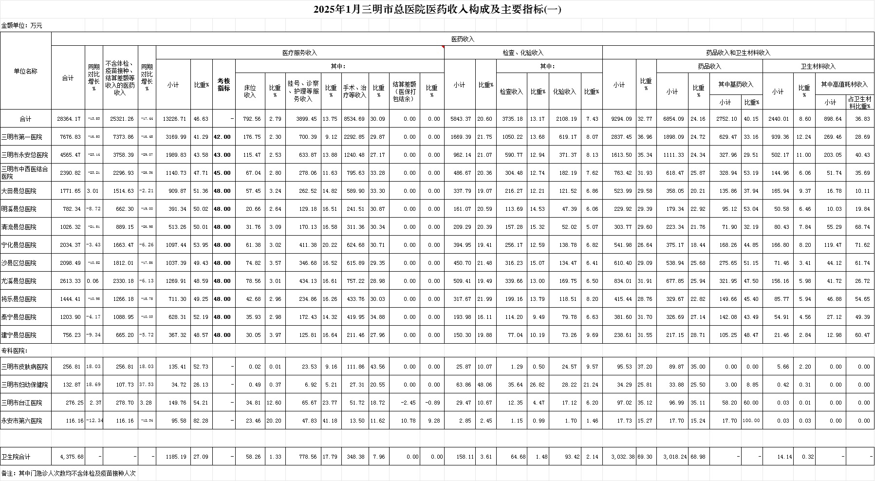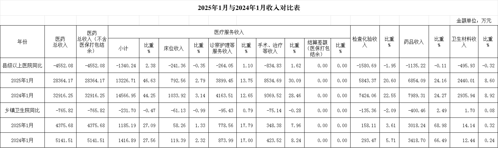 (一)1月份12家总医院运行情况:医药总收入28364.17万元,比去年同期32916.25万元减少4552.08万元,下降13.83%(不含体检、疫苗接种和结算差额等收入的医药收入为25321.26万元,比去年同期30670.52万元减少5349.26万元,下降17.44%)。其中:医疗服务性收入13226.71万元,占医药收入46.63%(床位收入792.56万元、手术治疗护理等服务收入12434.14万元),比去年同期14566.95万元,医疗服务性收入减少1340.24万元,下降9.20%;检查化验收入5843.37万元,占医药收入20.60%,同比下降21.29%;药品收入6854.09万元,药占比24.16%,分别比去年同期下降14.21%、下降0.11个百分点;卫生材料收入2440.01万元(其中高值耗材收入898.64万元),占医药总收入8.60%,比去年同期8.92%,下降0.32个百分点。入院人次24038人次,比去年同期32759人次,减少8721人次,下降26.62%;门急诊人次558571人次,比去年同期614460人次,减少55889人次,下降9.10%;每门诊次均费用201.93元,比去年同期193.08元,增加8.85元,增长4.58%;出院者平均费用6954.56元,比去年同期6395.94元,增加558.63元,增长8.73%。