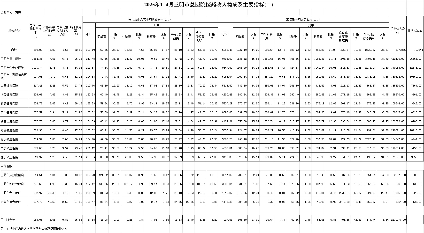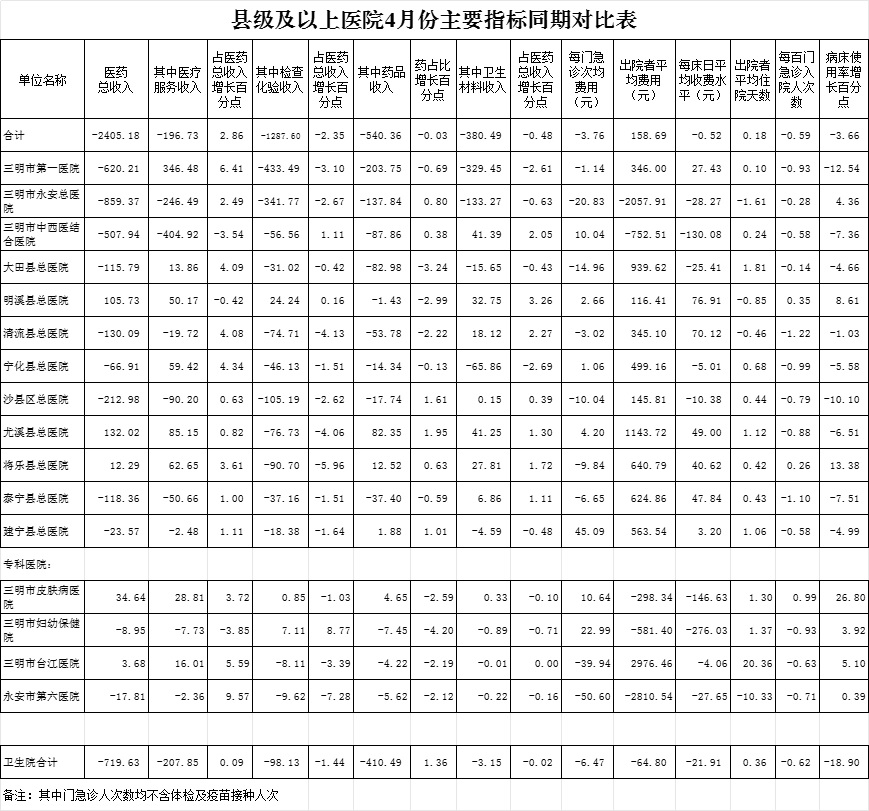 永安总医院44.41%、市中西医结合医院49.48%、大田县总医院52.03%、明溪县总医院50.75%、清流县总医院51.43%、宁化县总医院54.07%、沙县总医院49.36%、尤溪县总医院48.33%、将乐县总医院49.67%、泰宁县总医院52.8%、建宁县总医院49.23%,所有总医院均完成了考核指标。