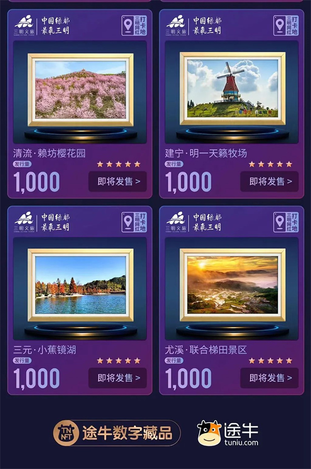 “首批博牛 网红打卡地数字文创产品”正式上线,十款数字文创产品即日起通过途牛旅游网销售,首批限量1万份。该藏品绑定了多重文旅权益,让拥有者能实惠、便利地玩转博牛 。