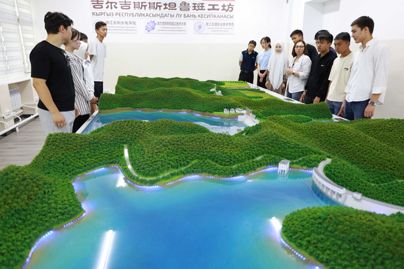 2025年6月4日,在吉尔吉斯斯坦首都比什凯克,师生在吉尔吉斯斯坦鲁班工坊水利枢纽工程模拟演示实验室学习水电站知识。新华社发(罗曼 摄)